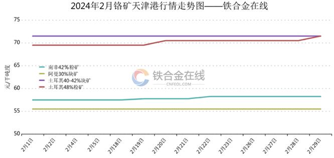 本月港口鉻精礦現(xiàn)貨價格紛紛上漲,主流系鉻礦塊價格以維穩(wěn)為主。春節(jié)期間南方部分工廠將進入停產(chǎn)檢修階段,北方工廠春節(jié)均保持正常生產(chǎn)。節(jié)前因在產(chǎn)企業(yè)以提前備貨充足,市場波動較小,因此鉻礦現(xiàn)貨價格以維持前期水平為主。節(jié)后隨著市場采購活躍性獲得提升,下游高碳鉻鐵零售價格平穩(wěn)堅挺,在需求支撐下,港口持倉礦商報價順勢上浮,工廠為維持生產(chǎn),只能妥協(xié)礦價上漲。從上圖可以看出,高品位鉻精礦漲勢更為明顯,1.高品位鉻精礦持倉礦商持倉量少,惜售情緒更加濃厚;2.紅海事件發(fā)酵后,供需錯配;3.期貨供應(yīng)商報盤少報價高等諸多因素都是支撐鉻礦現(xiàn)貨商家一味堅持高位報價的原因。